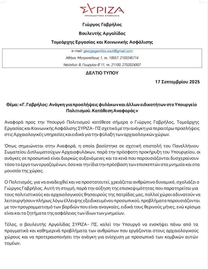 Ερώτηση 14 βουλευτών ΣΥΡΙΖΑ ΠΣ: Ανάγκη προκήρυξης τουλάχιστον 1.000 μόνιμων θέσεων Αρχαιοφυλάκων για το έτος 2026 στον παρακάτω σύνδεσμο!: